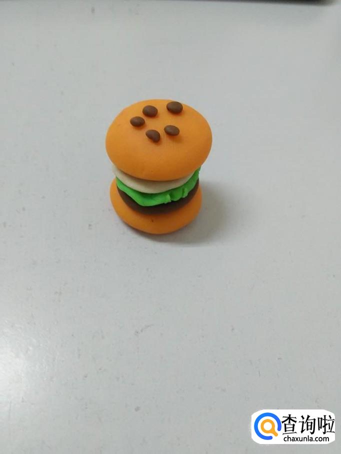 用棕色团几个小球,粘在面包上面,当作芝麻,汉堡就做好了。