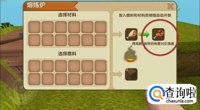 制作好熔炼炉后,分别把鸡腿和木材燃料放在熔炼炉里,稍等一会就合成烤鸡腿了。