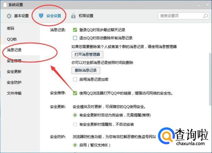 切换到【安全设置】选项卡,点击【消息记录】,如下图所示: