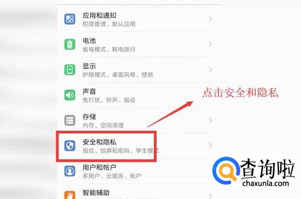 接下来在设置界面中选择安全和隐私选项,如下图所示