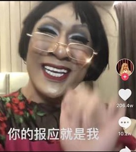 百因必有果你的报应就是我出自抖音韩美娟的恶搞视频中,由于韩美娟的妆容和独特的声音,听了这句话之后就有一种恶搞的味道,之后抖音上的这句话迅速在抖音上火了起来,大家也都开始纷纷模仿。