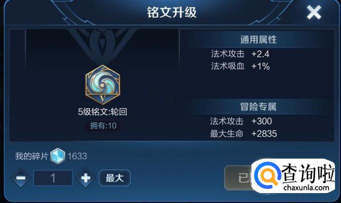 铭文“轮回”,效果是增加法术攻击和法术吸血,既能增加貂蝉的法术攻击又能增加她的吸血,所以蓝色铭文应该带10个轮回