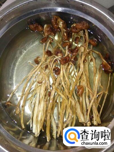 取一把茶树菇,将茶树菇的根部一个个剪掉一小段距离,再加点水泡软;