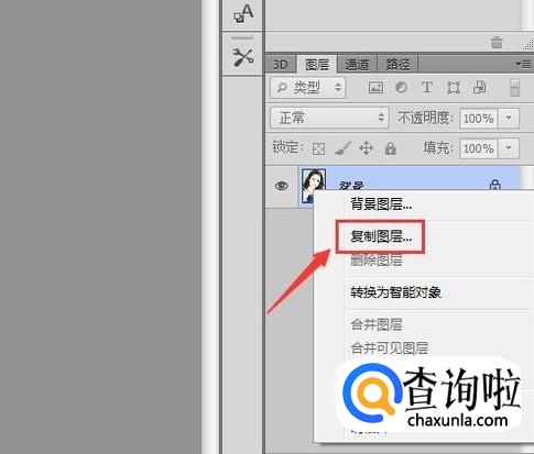 选择背景图层,然后在该图层上单击鼠标右键在弹出的右键菜单哪里找到复制选项,使用右键的方法我们也能够复制出图层,如图所示: