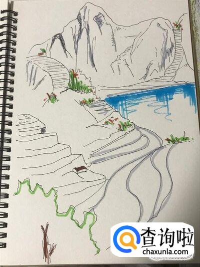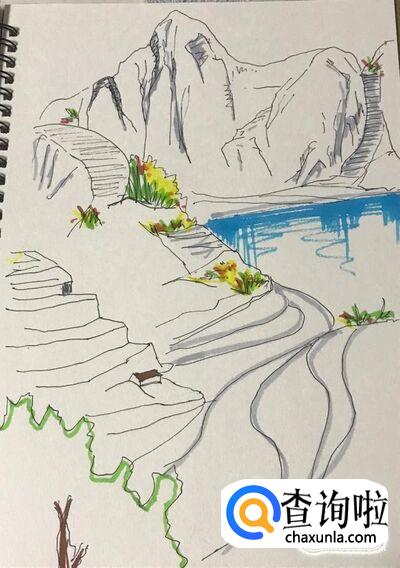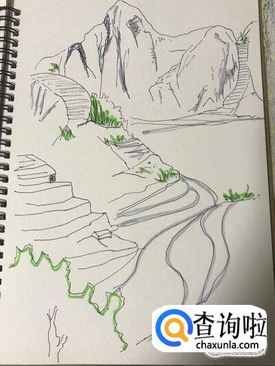我们需要让绿色水彩笔颜色干了以后,再上其它的颜色。然后我们要换灰色的水彩笔,首先给高山中刚才绘制的阴影部分上色。然后给中景的退台勾勒一圈阴影。