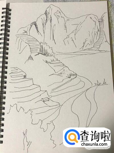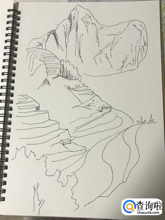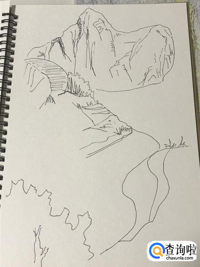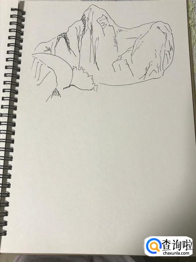 首页我们要勾勒出远山的轮廓,远山的大致形状要绘制出来,一般来说先绘制三角形的外轮廓,这是山的基本形态。