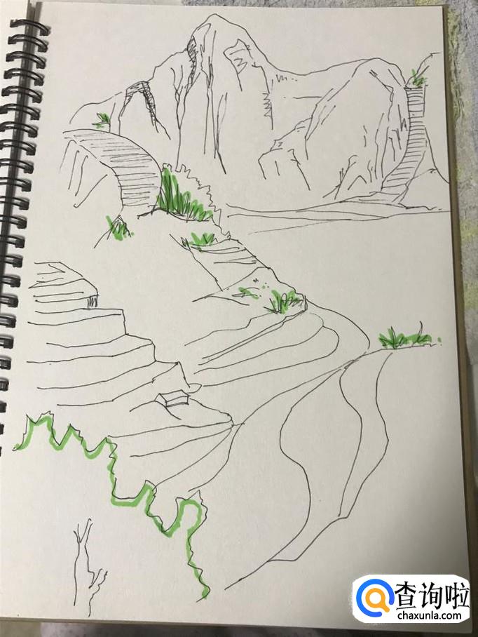 然后我们开始对其深化,添加纹路,山石褶皱的地方要多绘制一些阴影,同时我们也要绘制一些植物,植物绘制手法:勾勒轮廓就可以。