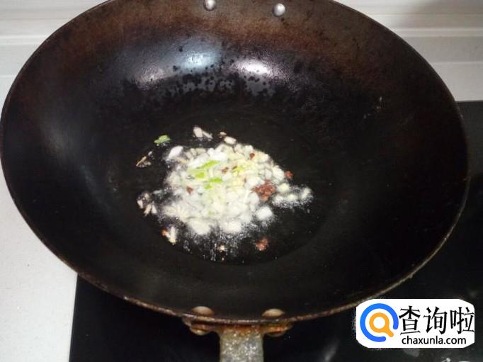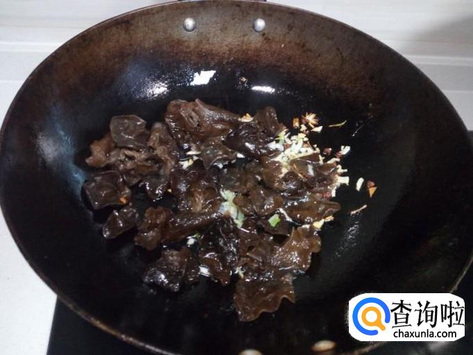 锅内放入油加热,油热后放入花椒,葱,姜,蒜,爆锅,放入木耳翻炒。