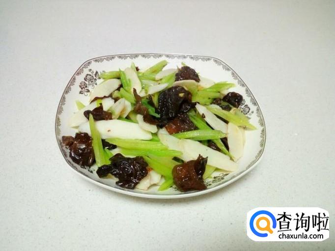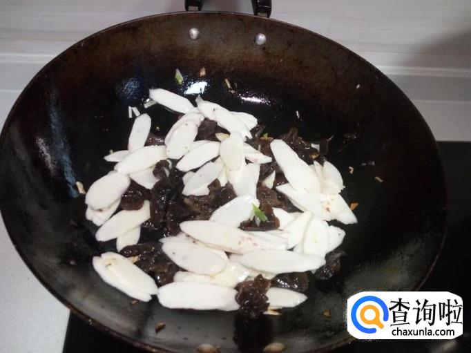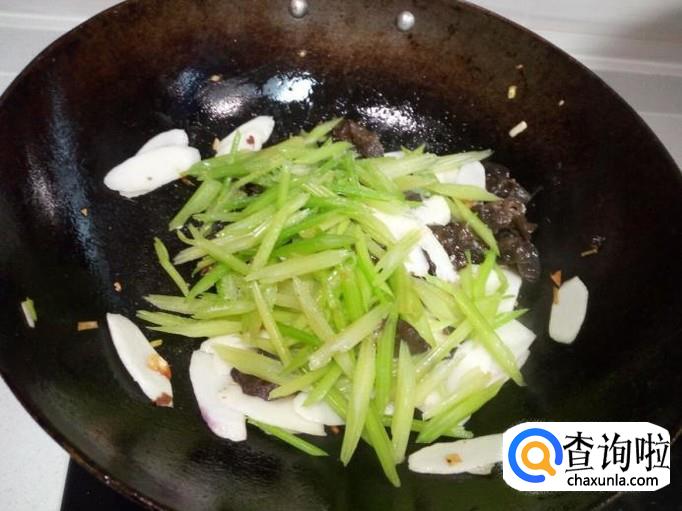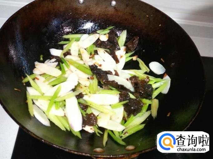 木耳炒至变软,放入山药片翻炒,放入少许白糖。山药略翻炒一下即可,放入芹菜,放入少许料酒,盐,大火爆炒。