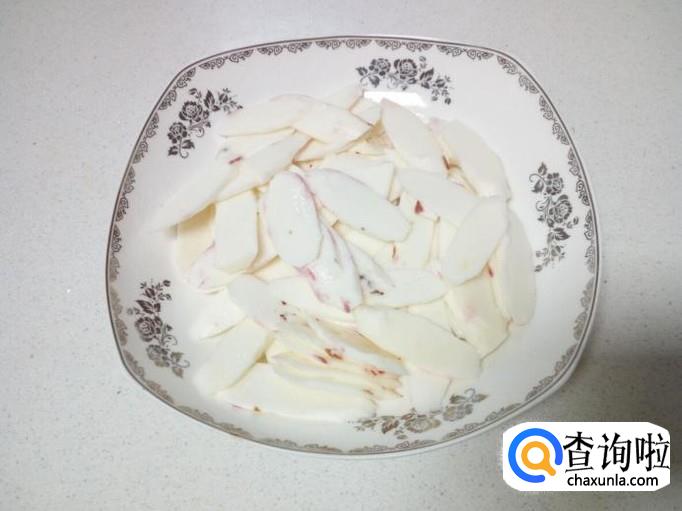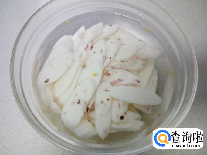 山药去皮,清洗干净,切成薄片,放入清水中浸泡一下,再用水投几遍,控干水分,备用。