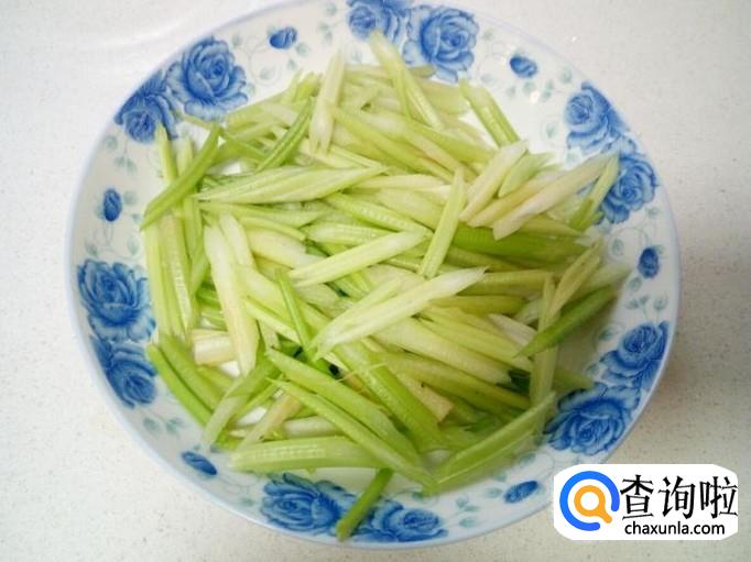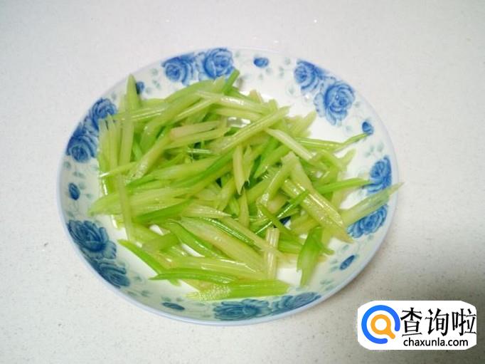 芹菜用开水汆一下,入锅几秒钟即捞出,迅速放入冷水中过凉,沥干水分,备用。