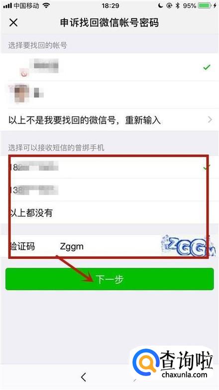 接着选择一个手机号码并填写验证码,最后点击下一步就可以了。