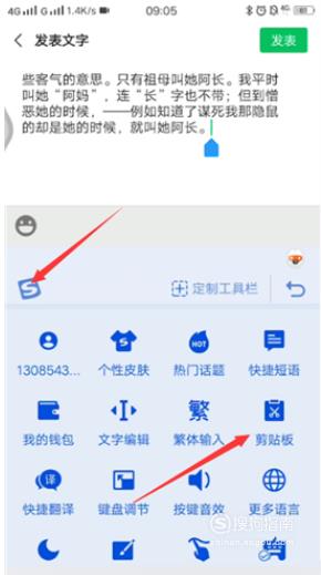 复制粘贴你要发表的文字,打开搜狗输入法设置,点击s图标,点击剪贴板