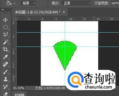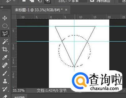 接下来用多边形工具在圆的底部参考线处点击,再往向左上方参考线与圆交叉的地方拉,再到最上一条参考线处点击。