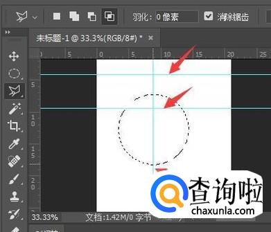 按Ctrl+R调出标尺,从标尺上拉出三条参考线如图,竖参考线在圆的中心。