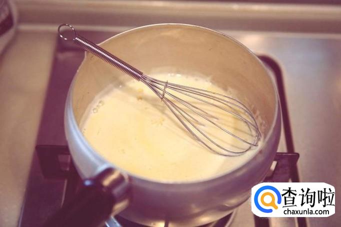 接着将调好的浆倒入锅中,边倒边搅拌均匀,搅拌完成是糊状的。