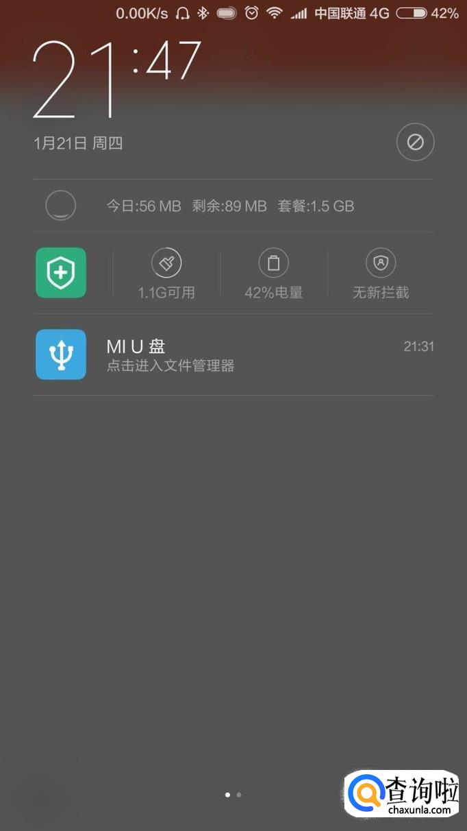 一般情况下如果有一些设备连接手机的时候,手机都会有自我保护看一下有没有截拦,我们应该在通知栏中找到u盘的信息,允许设备访问手机。