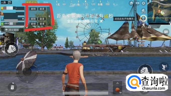进入游戏后,会有一段等待时间,在屏幕的右上方会有队友ID,在其ID旁即有跳伞跟随。