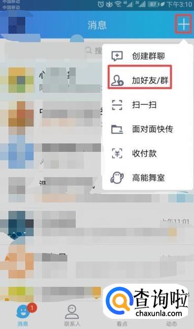 首先,我们打开我们手机上的QQ,然后我们点击右上角的添加按钮,弹出的界面,我们点击加好友/群;