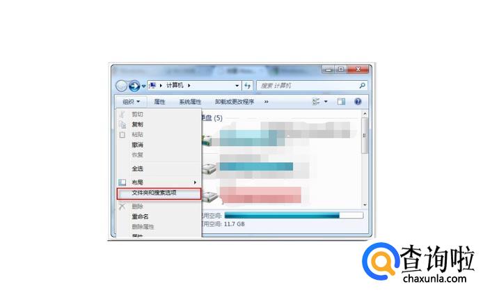 双击桌面上的“计算机”图标,找到左上角的“组织”-“文件夹和搜索选项”,点击它。