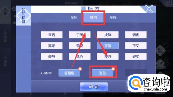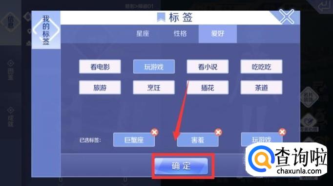 “爱好”内选择符合自己的爱好,三种标签选择完后,点击下方的“确定”这一项。