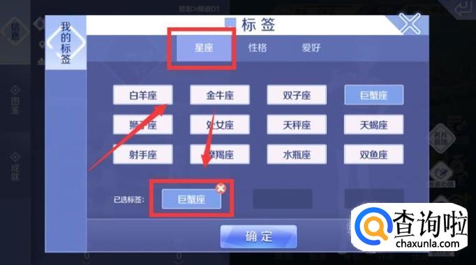 【标签】的窗口,在“我的标签”这一项,在“星座”内选择符合自己的星座。