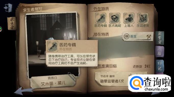 救命道具:镇定针管。这个是医生随身携带的道具。如果你玩儿的其他角色,也可以通过翻箱子来找到针管。它可以在你第一次被监管者打伤后帮助你恢复到满血状态。