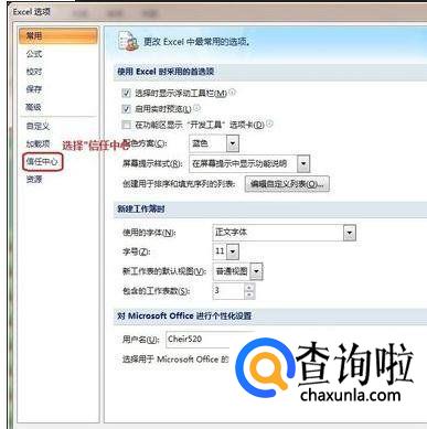 在弹出“Excel选项“对话框中,找到“信任中心“ 并单击,再在弹出的页面中找到“信任中心设置“并点击。