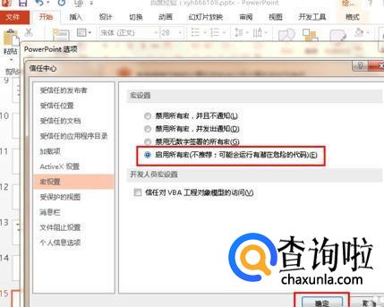 在“宏设置“页面中的“宏设置”下,在”启用所有宏“的按钮处点击一下,之后点击“确定”。