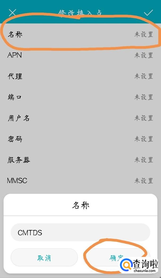 然后点击“名称”选项,将新建APN名称设置为“CMTDS”,设置完后点击确定