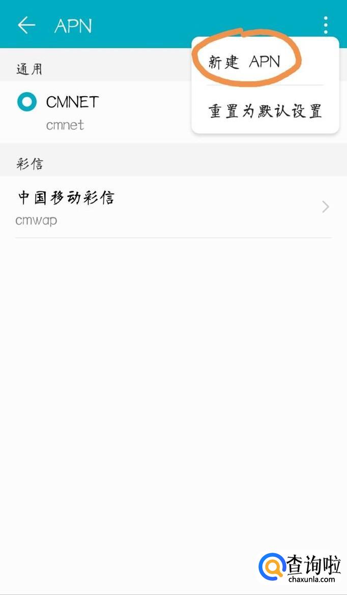 点击界面右上角三个点标志的菜单选项,在打开的菜单中选择“新建APN”功能