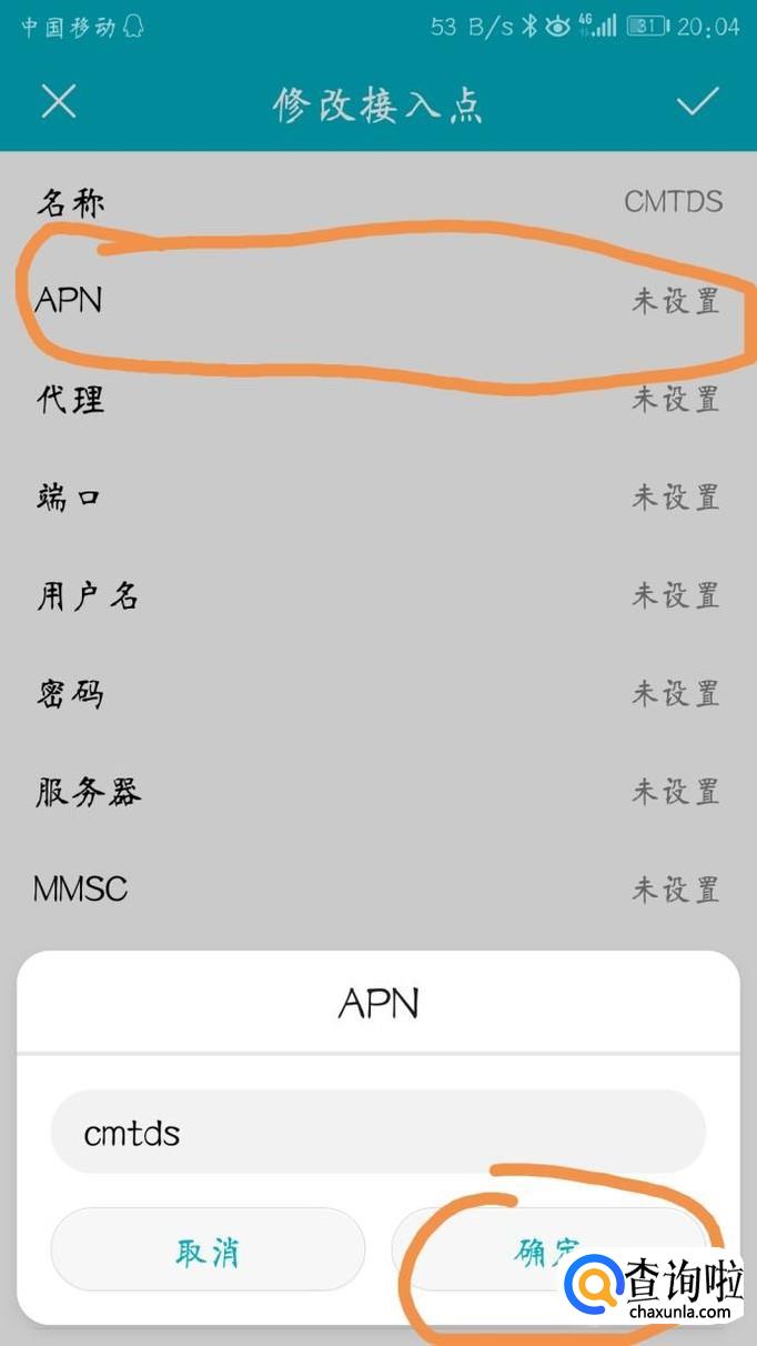 再点击“APN”选项,将新建APN接入点设置为“cmtds”,设置完成后点击确定