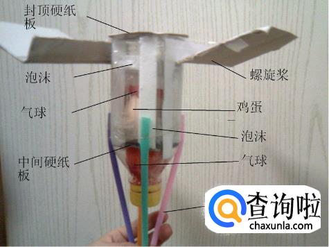 双气球型,就是将鸡蛋放在一个气球中,充入一定量空气,在外面再套一个气球,充入适量空气。这样两层气球之间就会形成一个气垫,会使鸡蛋免受地面的冲击。