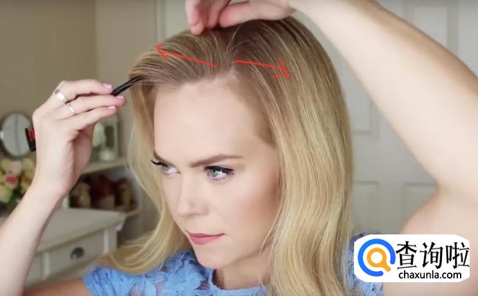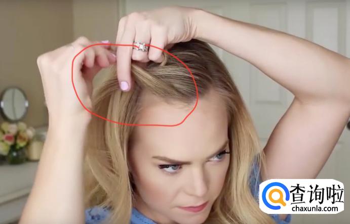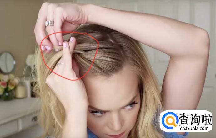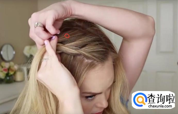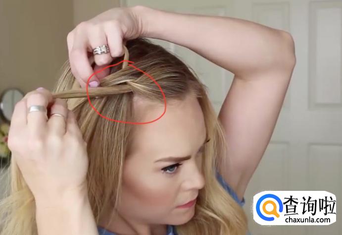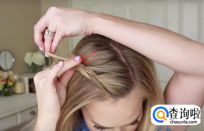 分好头发之后按照图示,用手指挑三股头发,然后将中间的头发穿过右侧的,将右侧的摆放在最上边,如图所示。