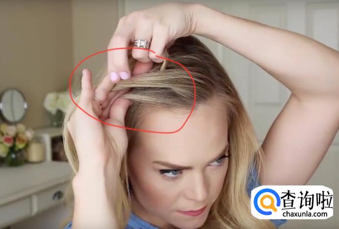 固定好之后最后挑一股头发,量不能够太少,如果所示进行固定缠绕。