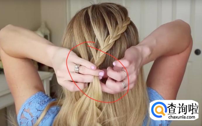 一侧的头发编织好之后,将开始整理后边的头发了,将已经编好的头发调整到脑袋后侧,将另一侧的头发挑一股过来,按照三股头发编辫子的手法来进行操作就好了。