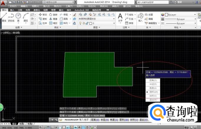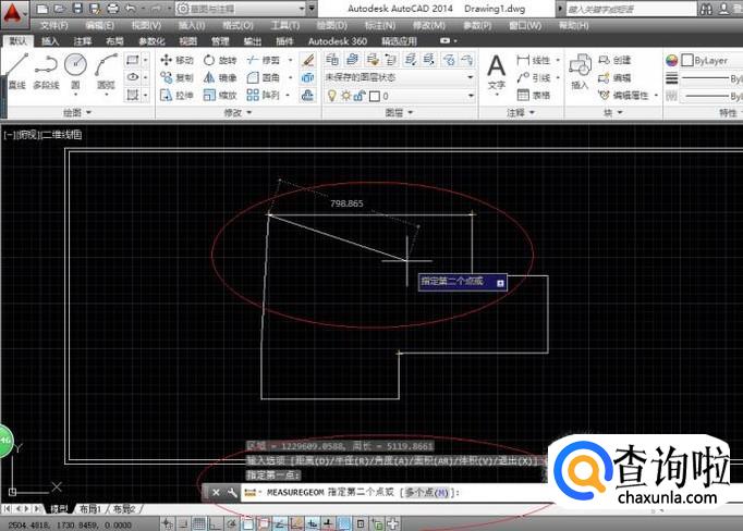 如图所示,命令窗口显示"MEASUREGEOM 指定下一个点或[圆弧(A)长度(L)放弃(U)总计(T)]"。依次拾取测量对象的下一个点,鼠标左键确认。
