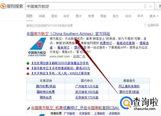 进入之后,以“中国南方航空”为例,用搜狗搜索点击并进入,如图所示。