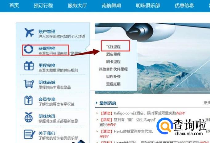 点击页面左边的获取里程中的飞行里程,进入查询页面,如图所示。