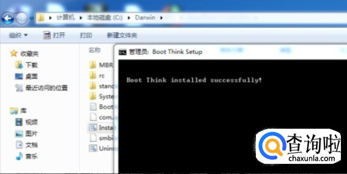 这里又需要第三方工具来引导这个Mac OS X文件安装盘才能开始安装系统,在这里我们用BootThink进行引导安装。安装BootThink之后,会在C盘根目录生成一个Darwin文件夹,如果BootThink在引导过程中出现了问题,或者你感觉Bootthink工作不正常,都可以在管理员模式运行下直接通过该文件夹中的install.bat批处理进行重新安装