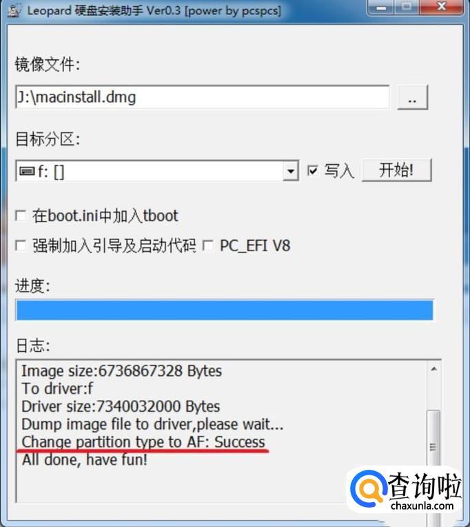 启动安装助手,在镜像文件一栏载入你刚才生成的新DMG文件,目标分区选择为Snow Leopard安装文件准备的分区,然后将下面的三个复选框对钩去掉并点击写入。这时候有需要等待数分钟或10多分钟,仍然取决于你电脑的整体性能和磁盘性能。完成后确认一下日志列表中是否出现了Change Partition type to AF: success字样,这句话表示已经将该分区类型标记成AF标签,Mac OS X可以存取的分区。