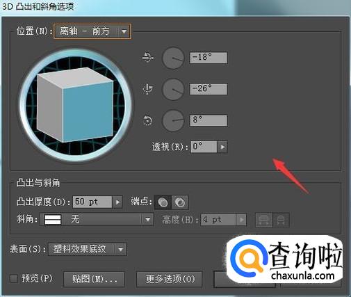 点击凸出和斜角选项在弹出的对话框内设置参数如图所示: