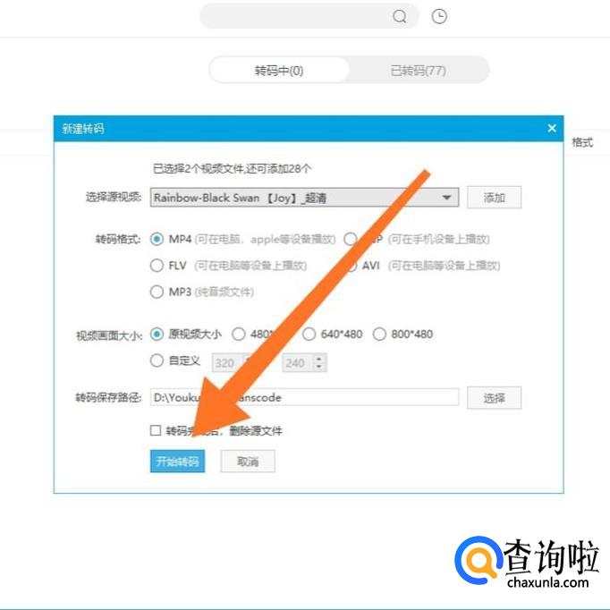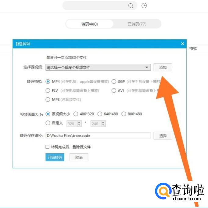 设置好转码视频的格式、画质和输出文件夹后,再点击“添加”按钮,选择源视频文件。