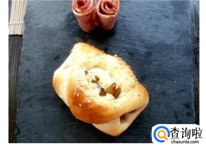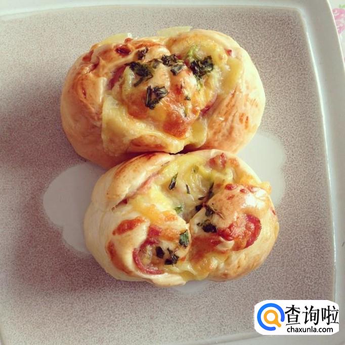 四角芝士培根包:面团擀开成条形,放2片芝士和2片培根,然后卷起来,在面团上划三个花刀,根部不要切断。把对角线上的两节捏到一起,放在一边发酵,然后刷蛋液,撒上芝士碎,180度烤箱烤20分钟。