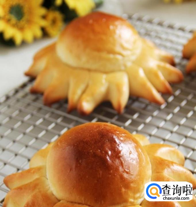 葡萄干太阳包:取一分面团擀成饺子皮形状,从圆心地方开始沿着直径切五刀但是不要切断边缘,然后从里向外翻开,就做好太阳包的外边光芒。然后取一份面团像包包子一样包入葡萄干以及其他果干或者坚果。放在之前的太阳边里面,然后等待发酵后刷蛋液,撒白芝麻,180度烤箱烤20分钟。