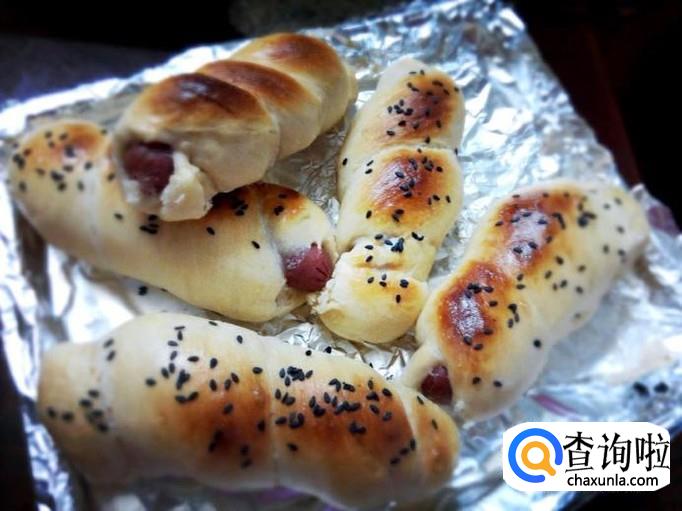 芝士开口香肠包:面团擀开成条形,中间放2根香肠,背面开四个花刀。将左半边的部分盖住香肠,右半边盖在左半边上,然后轻轻把右半边划开一个较大的口子。放在一边等待发酵后刷蛋液,在之前划开的地方撒上葡萄干、白芝麻和马苏里拉芝士碎(可以根据个人喜好放上坚果或者果干),180度烤箱,烤20分钟。