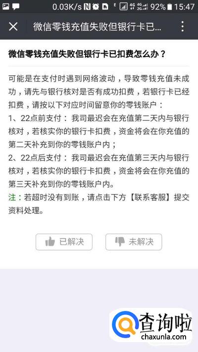查看官方推荐的解决方案,一般情况第二天会补充到你的微信零钱中;