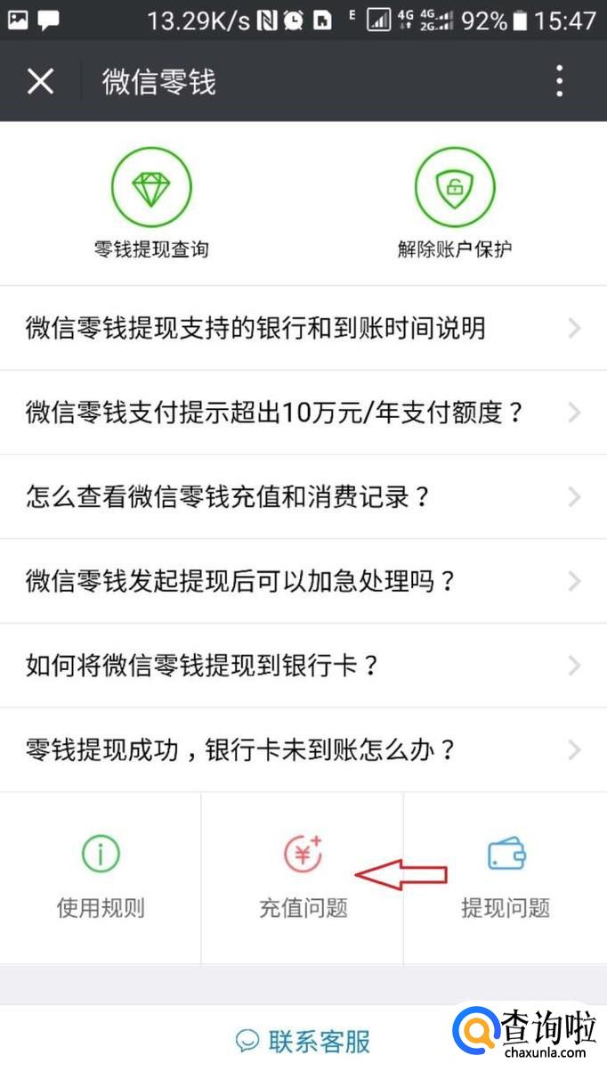 在跳转的“微信零钱”页面中直接点击正下方的“充值问题”按钮;