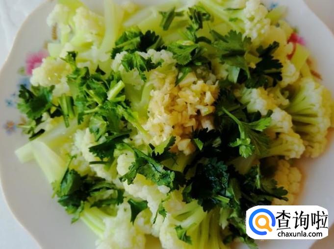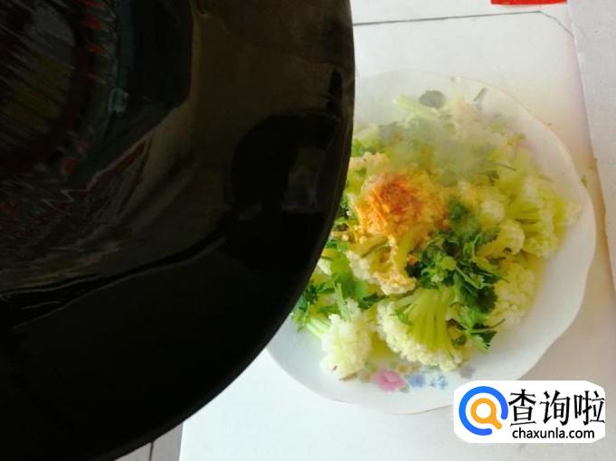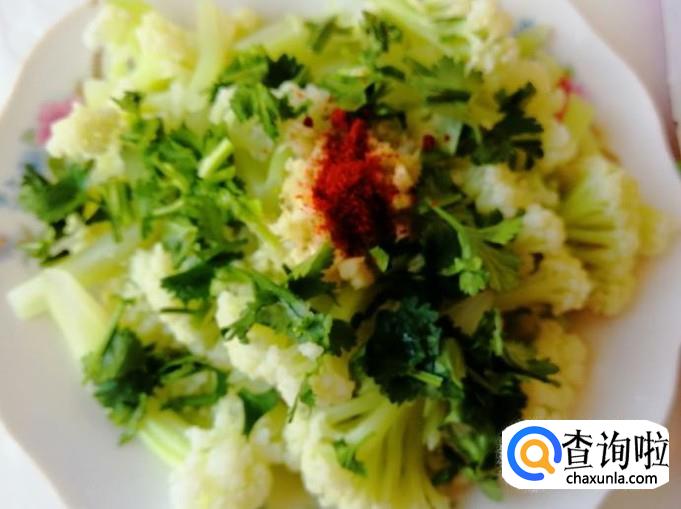 把烫熟的菜花盛入盘中,放入剁好的蒜末,还有准备好的的香菜也放好,这些调味品都根据自己喜好放就可以。