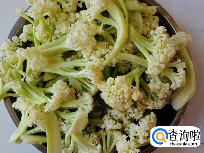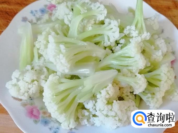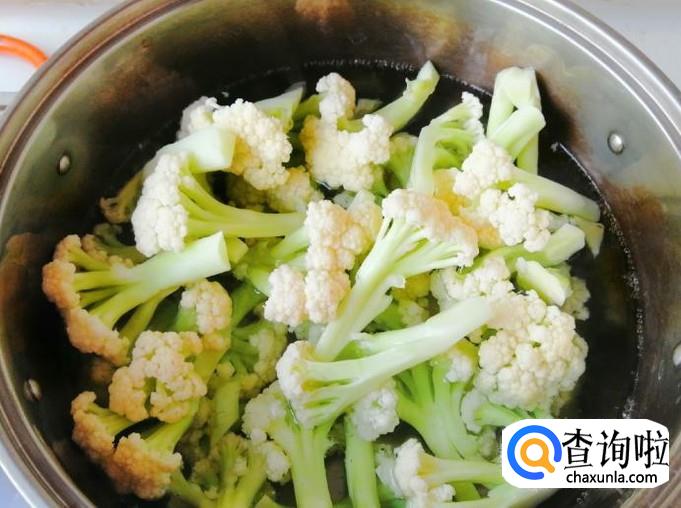 煮锅放适量水,开火把水烧开,然后把切好的菜花放入沸水中烫几分钟,菜花比较容易熟,我都是放入菜花煮开一两分钟后就关火,然后不打开锅盖再焖三分钟就可以了。